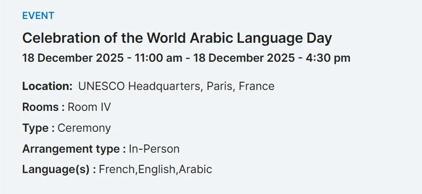 EVENTS: At UNESCO Headquarters in Paris; On December 18th; The celebration of World Arabic Language Day 2025 will be held from 9:30 am to 5:30 pm GMT. The UNESCO organizes round table discussions and cultural performances to explore innovative pathways for the Arabic language. This year’s commemoration also coincides with the 52nd anniversary of the proclamation of Arabic as one of the six UN official languages. To pay tribute to the poetic and artistic brilliance of the Arabic language, UNESCO will bring together researchers, academics, youth, and heads of international institutions. Together, let’s shape inclusive policies and practices for a richer linguistic future. Learn more about the event and Register to participate and Watch the webcast!