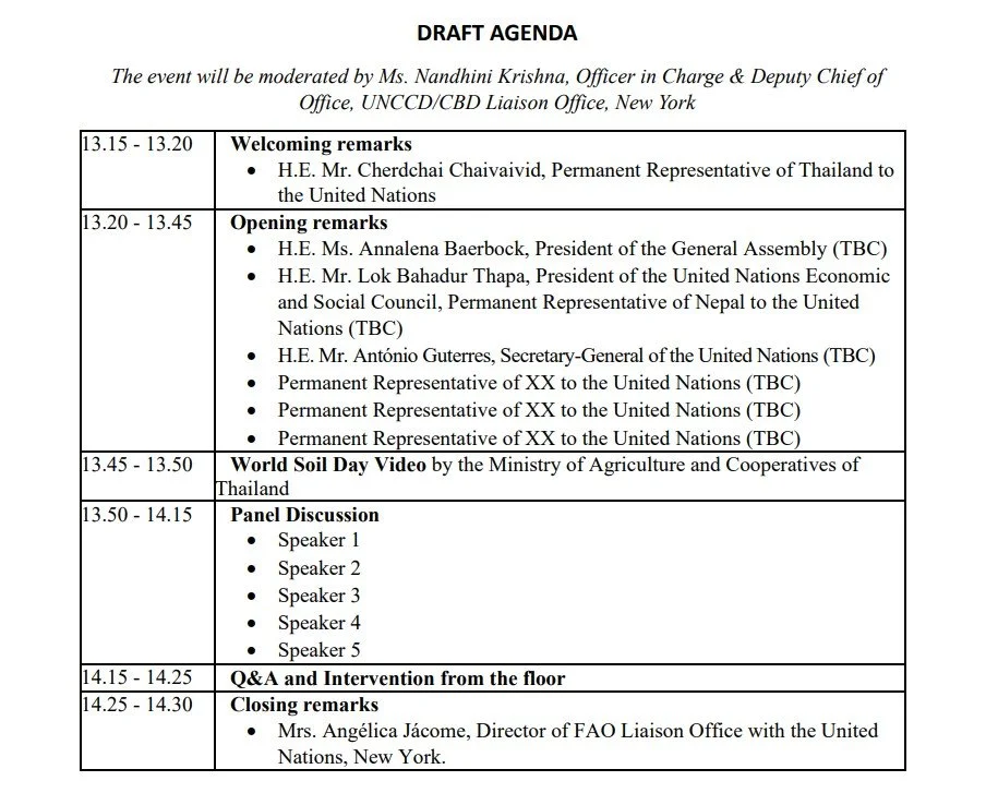 EVENT: On December 5th, from 13:15 to 14:30 GMT, the World Soil Day 2025 will be celebrated at FAO HQ in Rome, Italy. . Healthy soils are the foundation of life on Earth. World Soil Day (WSD) celebrates soils and raises awareness of their importance for sustainable agrifood systems and human well-being. The theme for 2025 is "Healthy Soils for Healthy Cities" and focuses on the role of soils in cities. During the celebration, we will celebrate soils and raise awareness of their importance for sustainable agrifood systems, climate action, biodiversity, and human well-being. The annual celebration, which also coincides with the birthday of His Majesty King Bhumibol Adulyadej the Great of Thailand, pays tribute to His Majesty’s lifelong dedication to championing sustainable soil management as a means to improve people’s quality of lives. The Permanent Missions of the Kingdom of Thailand, and XXX, together with the Food and Agriculture Organization of the United Nations, and United Nations Convention to Combat Desertification, invite you to commemorate the World Soil Day in New York, on 4 December 2025, from 13.15 - 14.30 hrs at Conference Room (TBC), UN Headquarters. The event will be conducted in English only and webcasted on UN WebTV. World Soil Day 2025 is a call to action. It invites policymakers, scientists, city leaders, civil society, and citizens everywhere to reimagine urban spaces through their soils, ensuring that people and nature can thrive together in healthy green cities. The event will feature a variety of voices including Member States, UN Agencies, New York City’s Mayor’s Office, scientists, professors, students and local farmers.