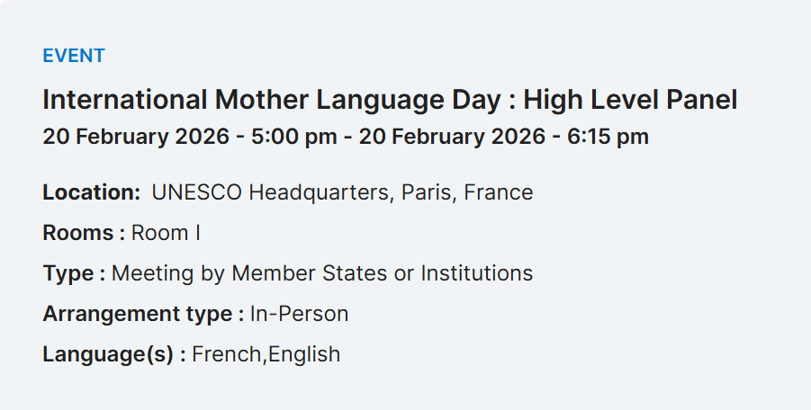 EVENT: On February 21st; The symposium to mark the 26th edition and the International Mother Language Day 2026 will take place from 17:00 pm to 18:30 pm in Room I at UNESCO House (Fontenoy). This year’s edition will highlight the vital role of youth in shaping multilingual education. Language is more than a communication tool. It is key to identity, learning, well-being and social participation and reaffirms the need for education systems that value every learner’s language to foster inclusion and improve outcomes. UNESCO places youth at the heart of this global conversation under the theme “Youth voices on multilingual education.”. The program of the 2026 celebration, organised by the Permanent Delegation of Bangladesh, will feature a high-level panel discussion with opening remarks by H.E. Khondker M. Talha, President of the General Conference, Ambassador, Permanent Delegate of Bangladesh to UNESCO, and H.E. Nasser Hamad Hinzab, President of the Executive Board, Ambassador, Permanent Delegate of Qatar to UNESCO, followed by an address by UNESCO Director-General Prof. Khaled El-Enany. A keynote address by Prof. Damián Blasi on “The future of mother languages in the AI era” will explore how artificial intelligence can either reinforce linguistic inequalities or help revitalize underrepresented languages. A ministerial panel discussion moderated by UNESCO Assistant Director-General for Education Stefania Giannini will examine the role of language in peacebuilding and sustainable development. The evening will conclude with cultural performances (from 7pm to 8:30pm) organized by the Permanent Delegation of Bangladesh, featuring contributions from Member States and celebrating the richness of the world’s linguistic heritage while reaffirming the value of every language. The event is by invitation only. Register to participate!