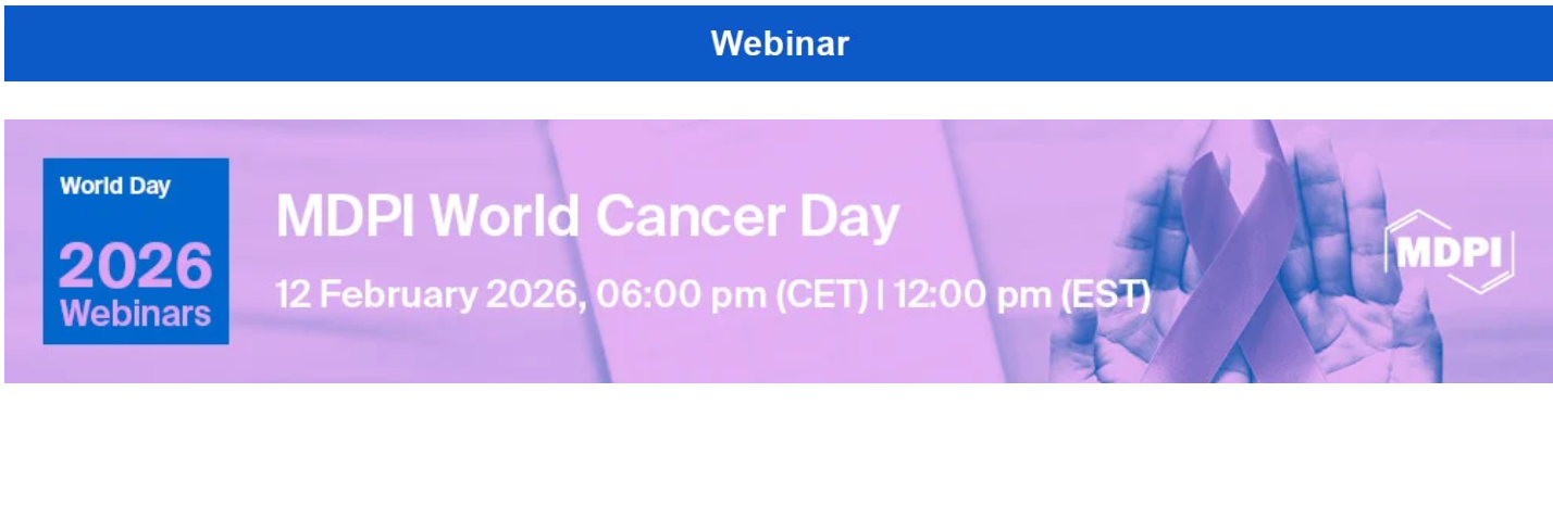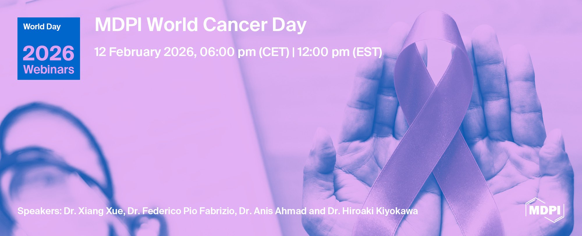 On February 12th, 2026, from 06:00 pm CET and 12:00 pm EST. The MDPI will host a webinar to mark the World Cancer Day 2026. In 2026, MDPI is honored to support World Cancer Day through a monthly awareness ries beginning in February. Each session will focus on a key cancer awareness theme, showcasing cutting-edge research and expert insights through specially curated landing pages and a dedicated webinar series. Through this special activity, we aim to sustain engagement and cross-disciplinary collaboration throughout the year. Explore the list of events. The Keynote Speakers are Dr. Xiang Xue, University of New Mexico, USA; Dr. Federico Pio Fabrizio, Kore University of Enna, Italy; Dr. Anis Ahmad, University of Miami, USA; Dr. Hiroaki Kiyokawa, Northwestern University, USA. Register for this webinar for free here!