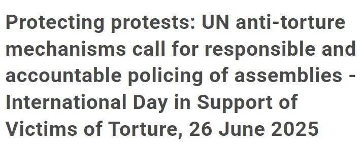 FORUM: "Protecting protests: UN anti-torture mechanisms call for responsible and accountable policing of assemblies." International Day in Support of Victims of Torture 2025. On this International Day, the experts called to reaffirm our collective resolve to build a world free from torture or ill -treatment. Preventing unnecessary and excessive use of force by law enforcement officials in the context of peaceful protests not only safeguards individual dignity but also ensures that all people can exercise their rights to freedom of expression, peaceful assembly and participation in public life, without fear. By upholding these rights and embracing responsible and accountable policing, States can foster environments where peaceful assembly is genuinely respected, and where the voices of all are heard and protected. The current scale of torture and other forms of ill -treatment is alarming worldwide, with a particular trend of heavy-handed and sometimes brutal policing of protests. Many authorities increasingly treat peaceful protests as security threats, rather than recognizing them as the lawful exercise of fundamental rights. Over the past year, the misuse of less lethal weapons in assemblies has caused serious injuries and deaths of protesters. Brutal assaults, mass arbitrary arrests and detention, torture during interrogations, unlawful killings and enforced disappearances have also been recorded. The experts emphasized that any use of force must comply with the fundamental principles of legality, necessity, proportionality, precaution and non-discrimination and must be strictly regulated in accordance with applicable international standards, including the Basic Principles on the Use of Force and Firearms by Law Enforcement Officials and the United Nations Human Rights Guidance on Less-Lethal Weapons in Law Enforcement. At all times, persons exercising their Rights to peaceful assembly, association and expression are to be treated humanely and with dignity. Demonstrators, including human rights defenders, political opponents, journalists, workers, students and even bystanders have been exposed to risks of ill -treatment, compounded by an increased militarization of the police, which instils a climate of fear and intimidation, incompatible with the right to peaceful assembly. “Restrictions on civic participation are being worsened by the ongoing availability of law enforcement equipment that, by design or impact, is considered inherently abusive, or is being misused,” said Alice Jill Edwards, Special Rapporteur on torture and other cruel, inhuman or degrading treatment or punishment. “ I am troubled by the ever-expanding development of torturous equipment. There must be limits placed on what equipment and weapons police and security forces can use against citizens. Support for an international agreement that regulates the use, manufacture and trade of certain items together with domestic implementation is sorely needed.” The anti-torture mechanisms have received worrying reports of the use of rubber -coated steel bullets, as well as water cannons, explosive grenades, defensive bullet launchers, pepper spray and other unknown chemicals being fired indiscriminately into crowds. An experimental acoustic weapon was allegedly used on protesters in one country, causing fainting, vomiting and disorientation. The experts recalled that States have a duty to conduct an independent legal review prior to deployment, to determine whether the use of a less -lethal weapon may, in some or all circumstances, be prohibited under international human rights law. Additionally, less lethal weapons must be handled responsibly, and only by those with proper training. States must further act promptly to ensure impartial and effective investigations into any complaint of torture and other ill-treatment.Follow the conversations with the hashtags: #Torture, #26june, #AgainstTorture, #TorturevictimsDay.