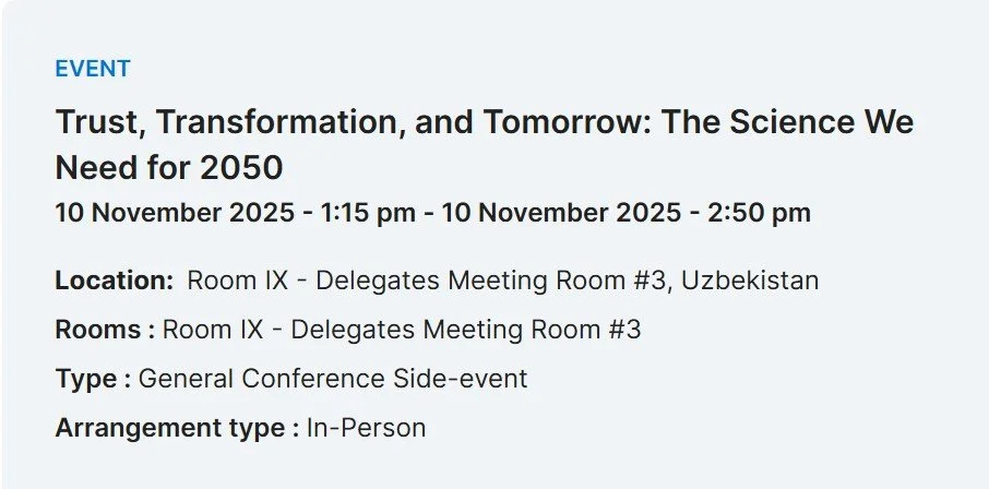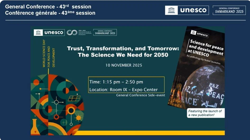FORUM: "Trust, Transformation, and Tomorrow: The Science We Need for 2050." World Science Day for Peace and Development 2025. Join us live from the 43rd session of the UNESCO General Conference as we celebrate the day with a forward-looking conversation on the future of science. This event invites participants to reflect on what kind of science—and what kind of relationship between science and society—will be needed to meet the demands of the coming decades. Together, experts and policymakers will envision the scientific and societal landscape of 2050 and discuss how science can shape a more just, sustainable, and peaceful future. The General Conference is UNESCO’s highest decision-making body, gathering delegates from all 194 Member States every two years to set the Organization’s global priorities and guide its actions for peace, inclusion, and sustainable development. Through this dialogue, UNESCO reaffirms its leadership as the foundation of global scientific cooperation and the driving force behind the Science Decade for Action. To join the global conversation on the science we need for 2050; Follow the conversations with the hashtags: #Science4Policy, #sciencematters, #ScienceDay, #10November, #sustainableDevelopment, #WorldScienceDayforPeaceandDevelopment.