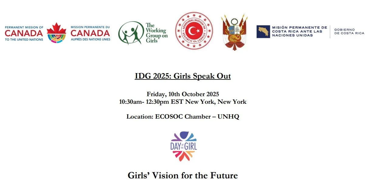 EVENTS: On October 10th, starting from 10:30am- 12:30pm EST at the ECOSOC Chamber in UNHQ New York, New York; As we commemorate International Day of the Girl 2025, we affirm that progress for girls must be led by girls. Under the theme: "We are here: Bold, Diverse, and Unstoppable - Demanding Action for Girls' Rights," this year's Girls Speak Out will highlight both the challenges girls face and the leadership, resilience, and solutions they bring forward. Hosted by the Working Group on Girls (WGG) and global partners, this 2-hour advocacy focused event is co-designed and co-led by girls. It brings together girl leaders, Member States, UN agencies, and civil society actors in a hybrid, intergenerational dialogue grounded in shared accountability and transformative action. Girls Speak Out 2025 is not only a celebration, but also a policy platform. It is where commitments are made, heard, and expected to be fulfilled. Let’s go beyond recognition to real action. Let’s ensure that when girls speak, the world doesn’t just listen—it responds. The event will include an intergenerational townhall consisting of two panels: “Girls on the Frontline of Crisis – Protection, Peace and Power” and “From Margins to Power – Girls Defying Discrimination and Reclaiming Identity.” The speaker are: • H.E. Annalena Baerbock, President of the United Nations General Assembly • H.E. Gustavo Lino Adrianzén Olaya, Permanent Representative of Peru to the UN • H.E. Maritza Chan, Permanent Representative of Costa Rica to the UN • H.E. Michael Gort, Deputy Permanent Representative of Canada to the UN • H.E. Aslı Güven, Deputy Permanent Representative of Türkiye to the UN • Ms. Lauren Rumble, Associate Director, Gender Equality, UNICEF • Ms. Lopa Banerjee, Director, Civil Society Division, UN Women • Ms. Cecile Mazzacurati, Gender Advisor, Programme Liaison Branch, UNFPA • Girl moderators